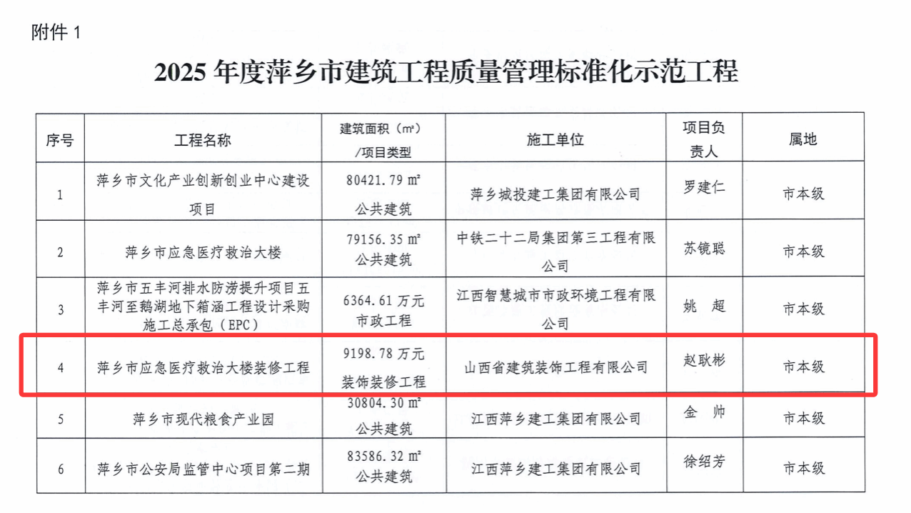 11月26日,萍乡市住房和城乡建设局公布2025年度建筑工程质量管理标准化示范工程、建筑工程安全生产标准化示范工程名单。山西省建筑装饰工程有限公司凭借在安全生产管理与质量技术创新领域的卓越表现,捷报频传,由公司承建的萍乡市应急医疗救治大楼装修工程项目成功获评2025年度“萍乡市建筑工程质量管理标准化示范工程”及“建筑工程安全生产标准化示范工程”称号,实现 “双荣誉”加持 ,彰显了公司在工程建设质量、安全生产...